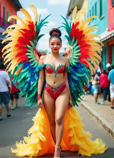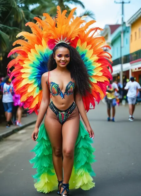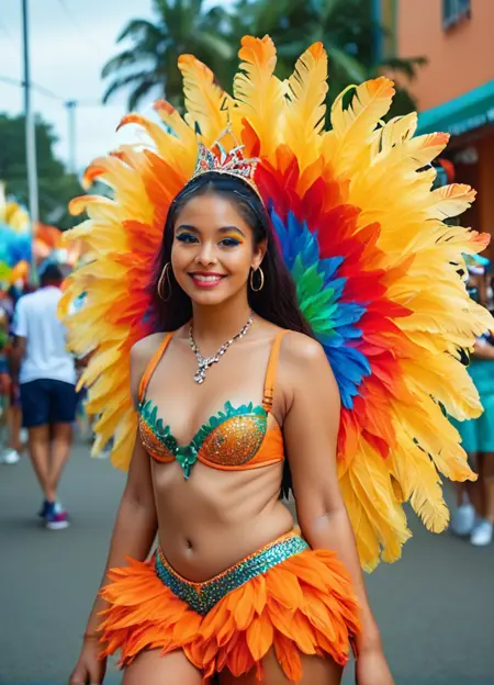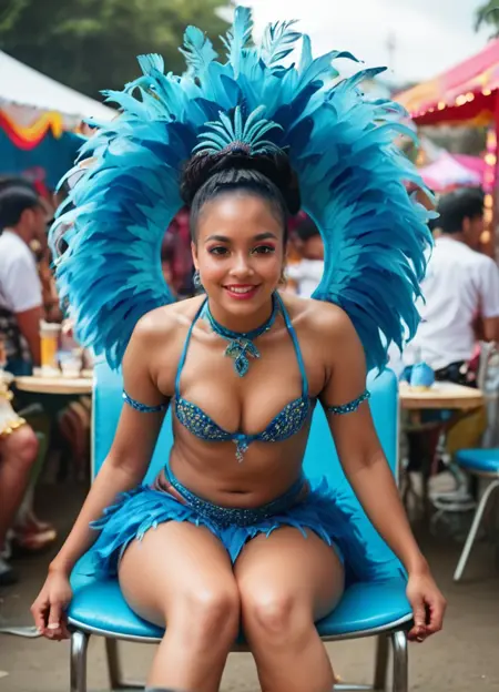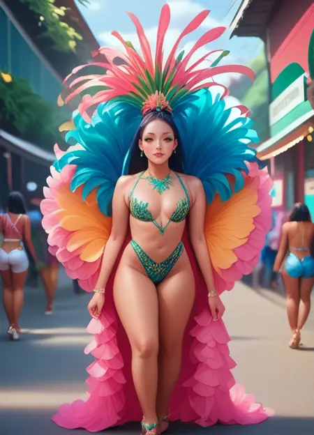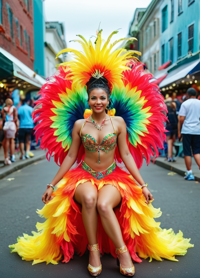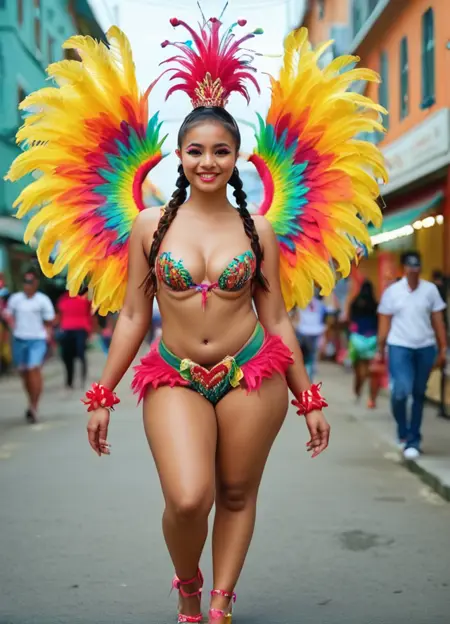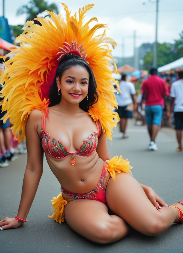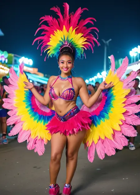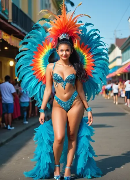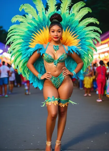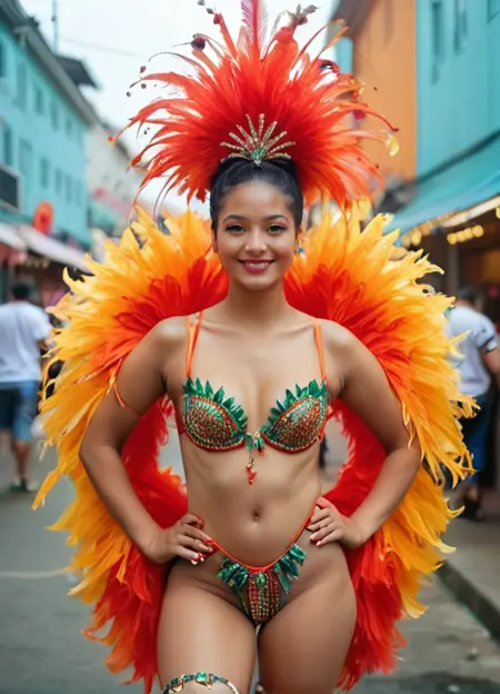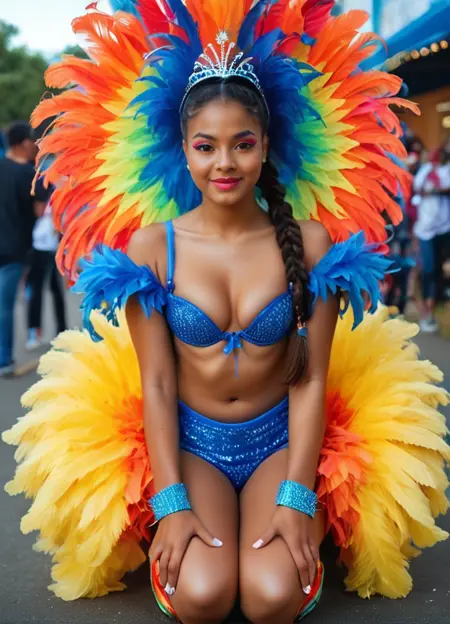 example: bright carnival costume dancer with Medium Brown feathers thigh stocking, arm bands