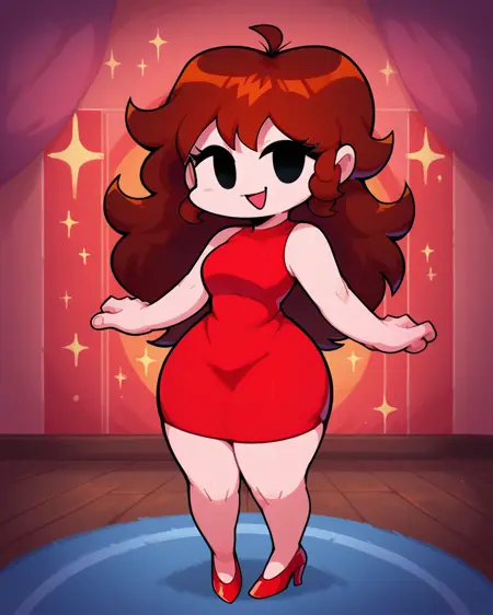 推奨プロンプト: 茶色の髪、黒い目、赤いドレス、ハイヒール、shortstack