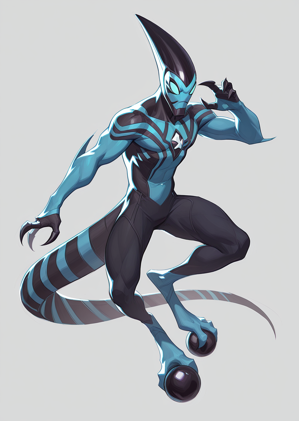 프롬프트: Kineceleran, 1개의 꼬리, 발톱, 3개의 손가락, 2개의 발가락, 발바닥에 공, 얼굴에 선, 달모양의 머리