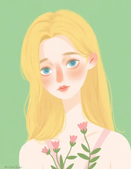 ashui illustration style, art, drawing, digital art, portrait, girl, blonde hair, blue eyes, flowers, orange lora:ashui_flux_v2:1