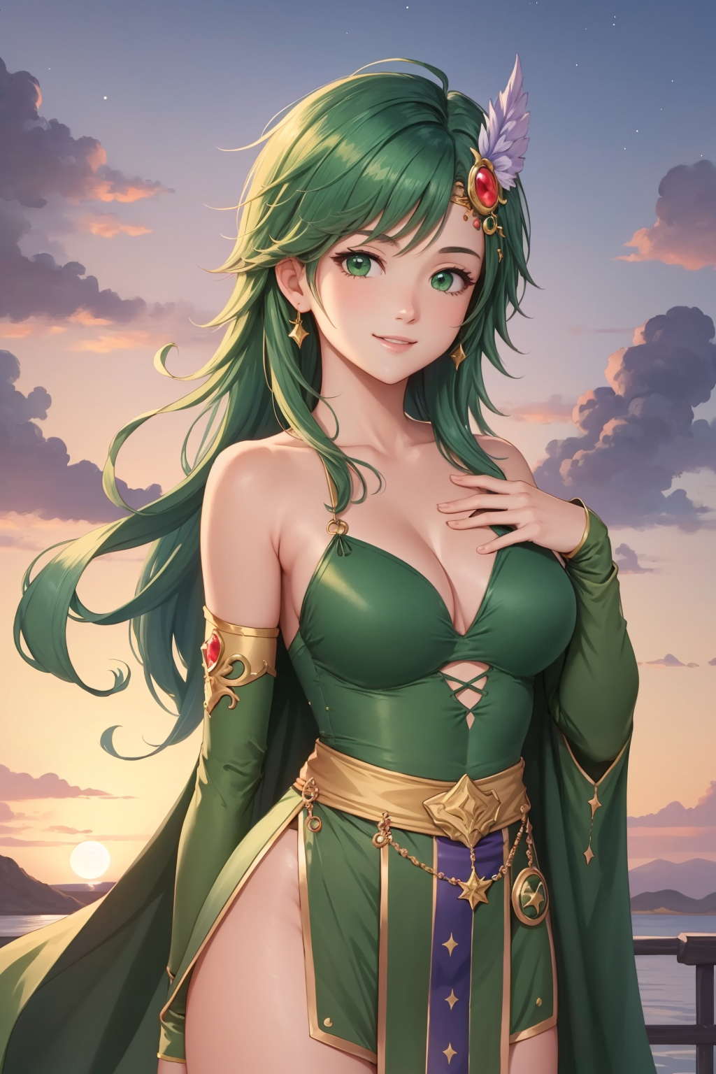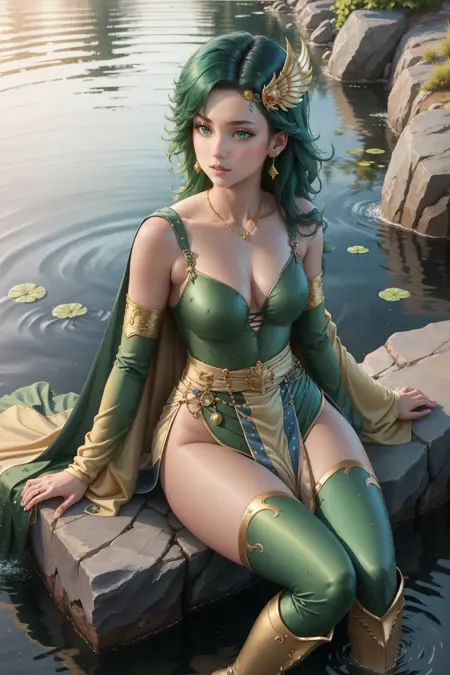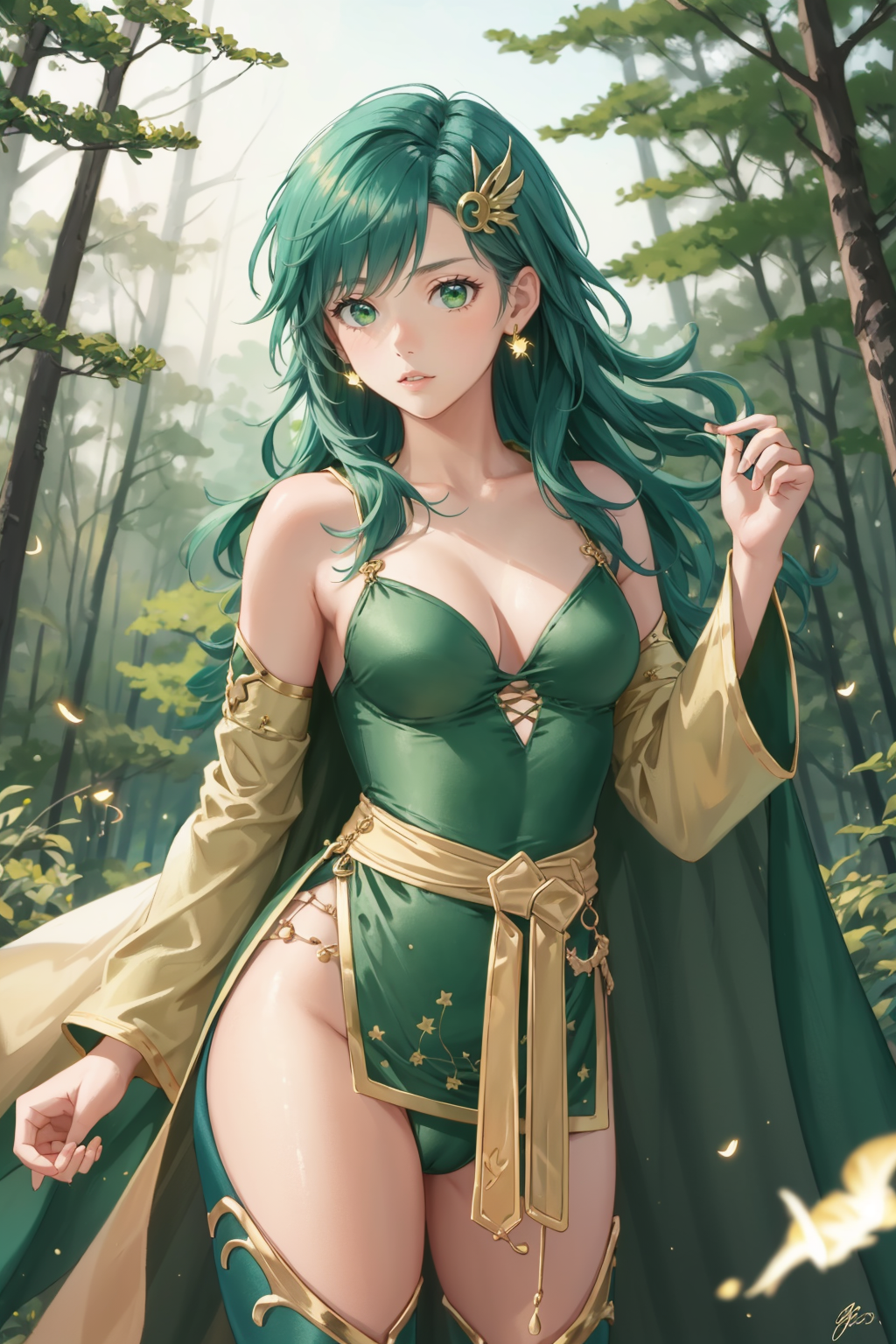 전형적인 외모를 위해 "초록색 캡, 머리 장식, 초록색 레오타드, 벨트, 벗겨진 소매, 무릎 윗부분 부츠"를 추가하세요.