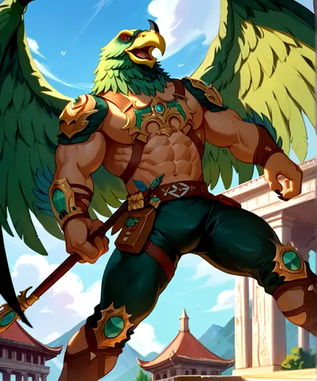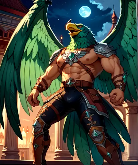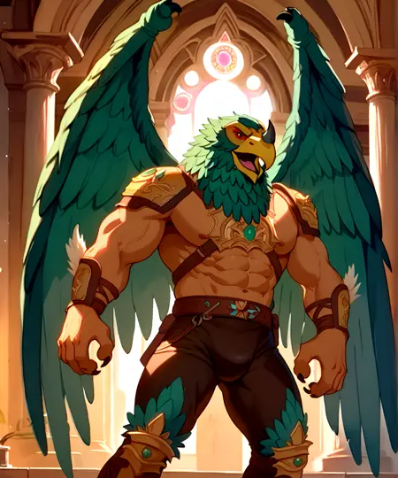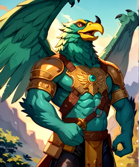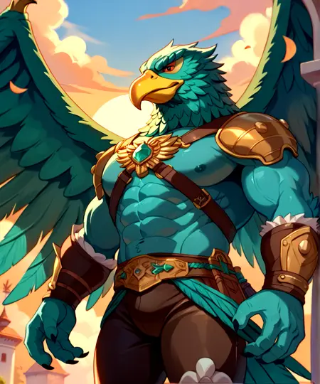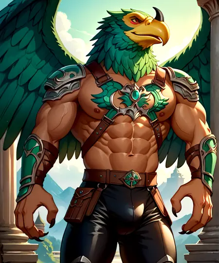 이 모델의 프롬프트는 다음과 같습니다: Harakht, 매머리, 청록색 깃털, 강력한 근육질 몸매, 붉은 눈, 부리 위의 짧은 검은 뿔, 노란 부리.