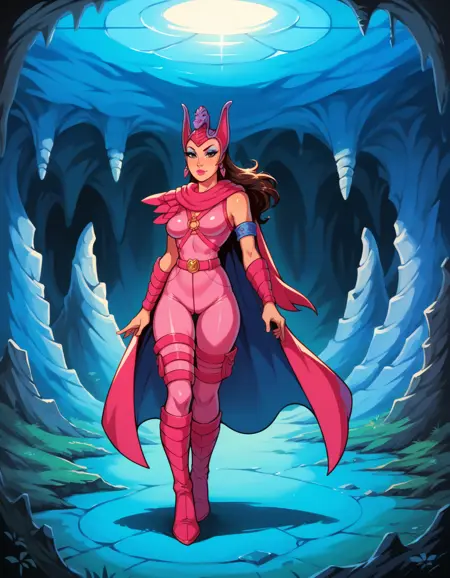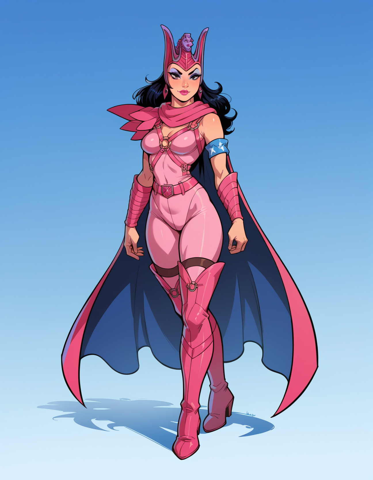 1girl, black hair, solo, lipstick, makeup, eyeshadow, pink belt, pantyhose, pink chest harness, earrings, helmet, bodysuit, bracer, armband, scarf, cape, gem, weapon,