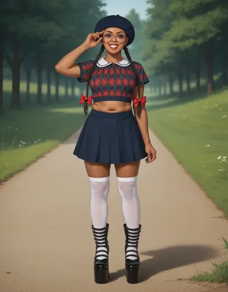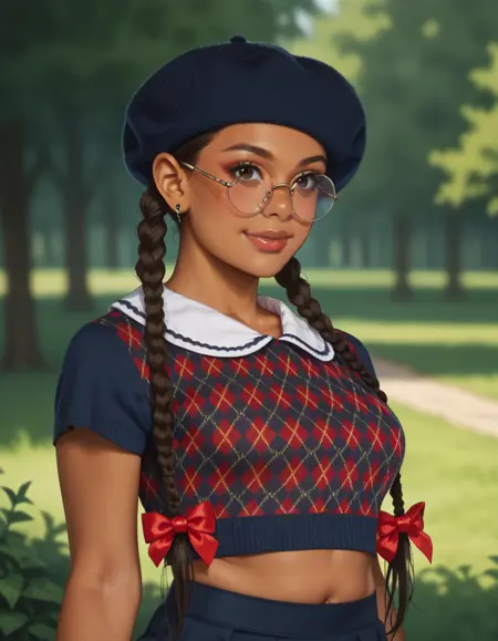 Keywords: hud_n3rd, hat, crop top, midriff, skirt, upper body, round eyewear