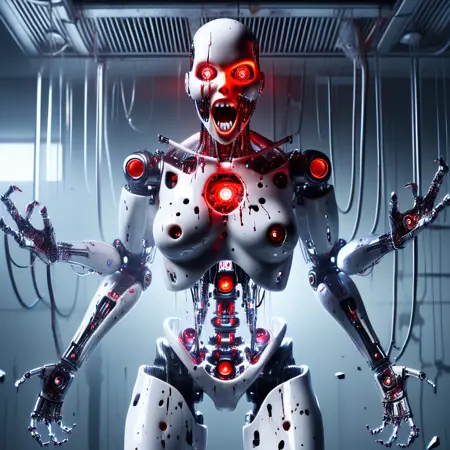 Rogue robot Female v2. EPOCH 9 and EPOCH 10 are the closest to my trained images. however, quality wise; 7 and 8 are better. Way more improved tagging, more images. ---- humanoid robot, 1girl, dark skin, very dark skin, dark-skinned female, synthetic skin, robot joints, full body, mechanical parts, solo, no humans, glowing red eyes, skull nose, nose, open lips, open mouth, lips, closed mouth, teeth, mechanical arms, mechanical hands, open hands, palms down, palms up, mechanical fingers, mechanical legs, mechanical feet, barefoot, horror (theme), breaking through a concrete wall, damaged, close-up, portrait, mechanical wings, breasts, indoors, outdoors, looking at viewer, parted lips, smile, teeth, glowing, oil dripping, grease, ass, mechanical eye, red eye, eye focus, (lesser tags: extra arms, kneeling, squatting, one knee, from behind, flying, tears, crying, Feminine "for hands", cables, wires, Indian style, meditating, cracked concrete wall, destruction), EPOCH 9 and EPOCH 10 are the closest to my trained images. however, quality wise; 7 and 8 are better.