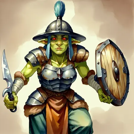 Gobbo, helmet, armor, red eyes, red sclera, pointy ears, holding sword, shield,