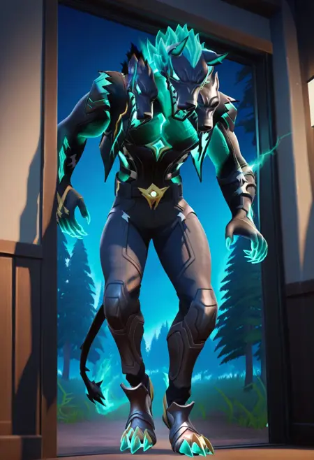 cerberus, 인체형 헬하운드, 어깨 위에 늑대 머리, 찢어진 재킷, 근육질的身体, 푸른색으로 빛나는 눈, 검은 털, 불길이 핀 청록색 가시 모양의 머리카락, 뾰족한 귀, 어두운 전술복, 회색 바지, 청록색 빛나는 장식, 금색 버클이 달린 벨트, 청록색으로 빛나는 가슴 갑옷, 팔 보호대, 한 팔에 달린 가시 사슬, 발가락이 발톱처럼 생긴 갑옷 신발, 발톱이 달린 손, 작은 뱀 머리가 달린 긴 검은 꼬리, 초자연적인 검은색과 청록색 불꽃, 가슴 근육,