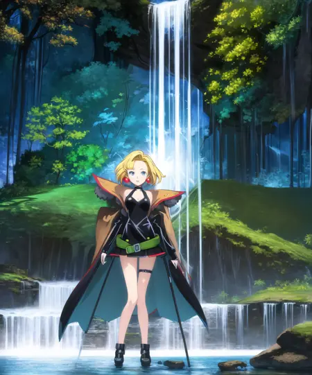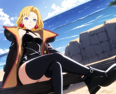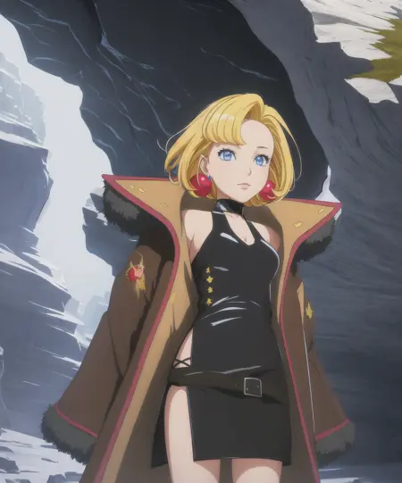 示例提示词:lora:witch_maria:0.75, witch_maria, 1girl, jewelry, blonde hair, solo, blue eyes, earrings, black dress, coat。