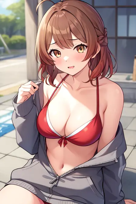 夏季服装: hanamiumesummerGIM,发髻,单侧发髻,胸部曲线,锁骨,辫子,ahoge,中长发,红色比基尼,灰色夹克,比基尼内搭,部分拉开拉链,