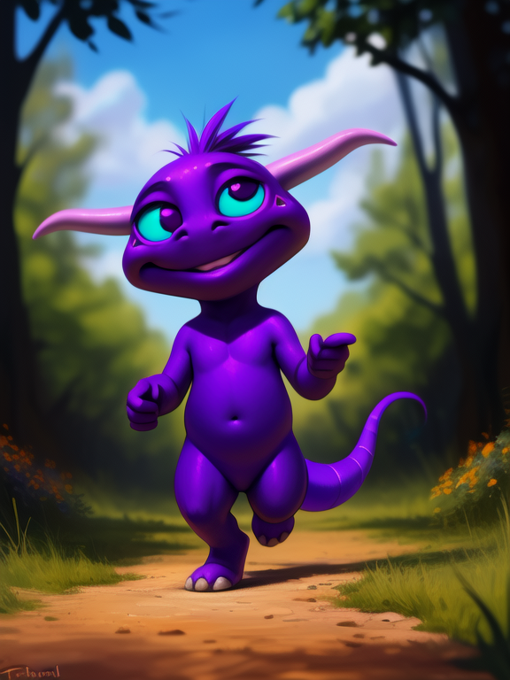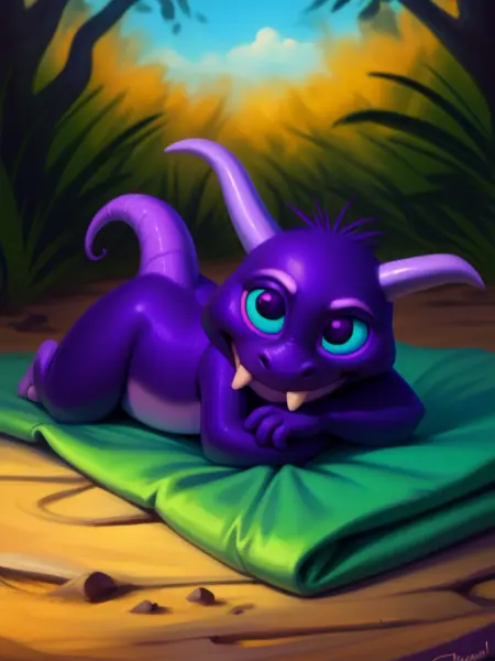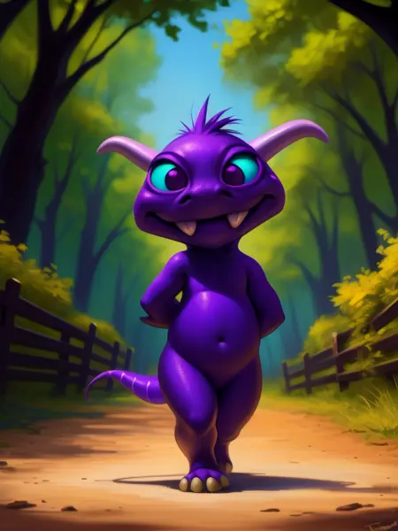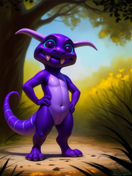 Monotook, blue sclera, purple eyes, purple skin, tail, horns, chibi,