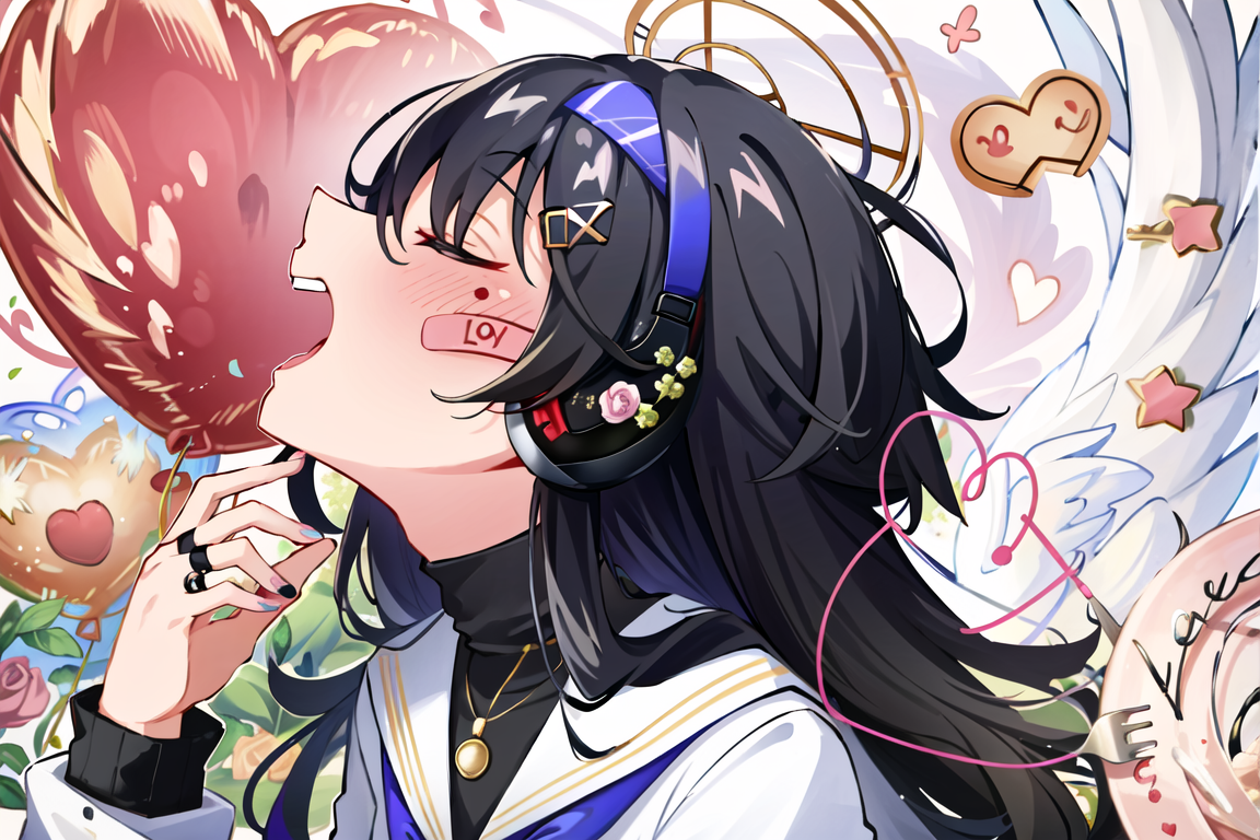 お勧めのプロンプト: Ai Kotoba, 口を開けた状態, 髪飾り, 閉じた目, 花, ハート, 食べ物, 翅, 星(記号), 繊維, プロフィール, 果物, サクラ, ヘッドフォン, リング, テープ, フォーク, ハートの髪飾り, 面にテープ, バルーン, 頬にテープ, ハートのバルーン