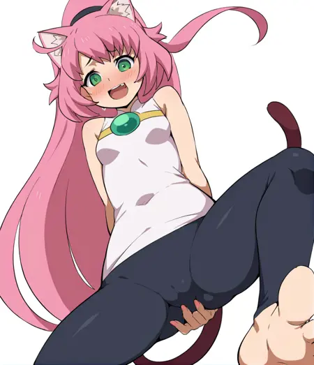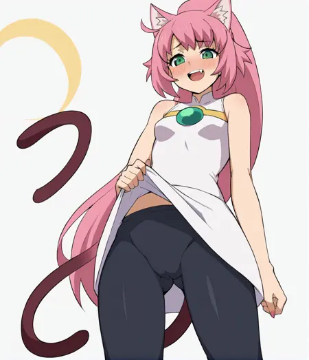 粉色头发,长马尾,绿色眼睛,小乳房,猫耳,尾巴,