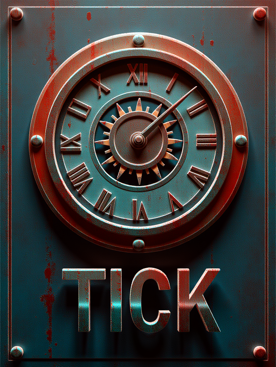 Gears of Time + タイトル:下部右隅に「Tick」、メタリックフォント + コンテンツ:歯車が露出したステムパンク時計、小さなキャラクターが針を調整中 + 背景:青銅とシルバーのトーンを持つメタリック背景、赤と青のネオンハイライト