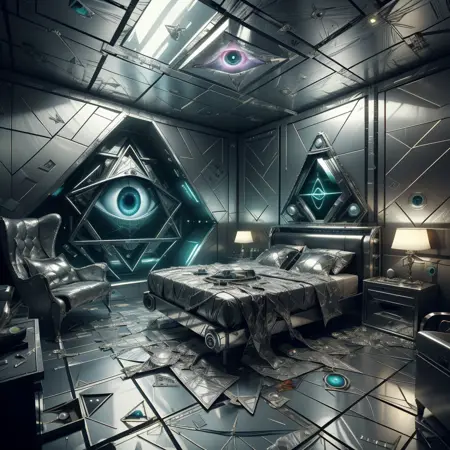 foil, occult, illuminati, eerie,"healthy LoRA weight range from 0.9 to 1