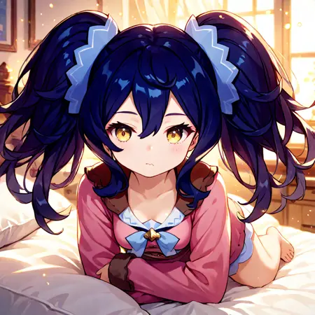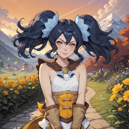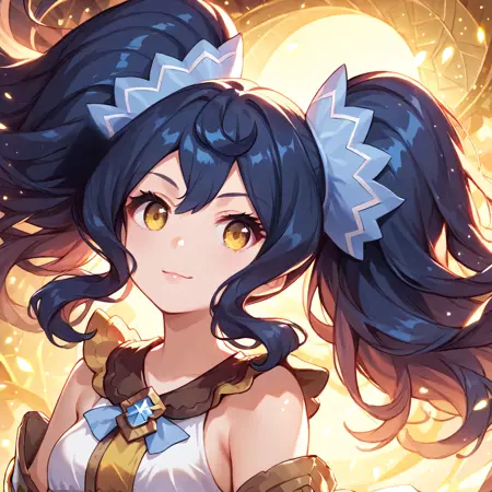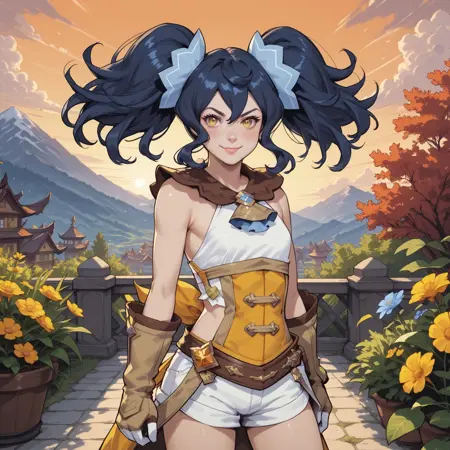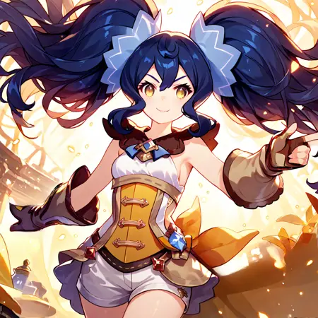 Trigger words: Renee (Dragalia Lost), twintails, bangs, blue hair, yellow eyes, hair ornament, small breasts, 1loli, globes, corset, shorts, boots,