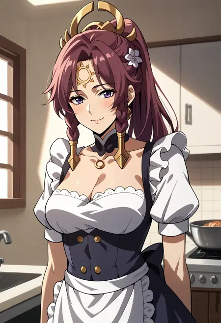 jialuo,Purple red hair, ponytail,long hair,braids,tiara,gold forehead mark,floral hair accessory,earrings,purple eyes,