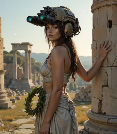 Fluxの現代軍用ヘルメットの理解は約20年前のものであり、ナイトビジョンゴーグルをプロンプトに含めると、単に緑色に着色された通常のゴーグルとして生成されます。