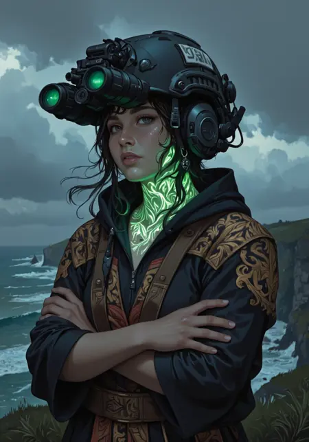 ヘルメットやゴーグルの詳細を記述すると、より良い結果が得られます。私のショーケース画像を参考にすると良いでしょう。例:「ナイトビジョンゴーグルを装備した現代の軍用ヘルメットを着用。ヘルメットには迷彩パターンが施され、通信機器が搭載されており、目の上に緑色レンズの二本管のナイトビジョンが装着されている」。