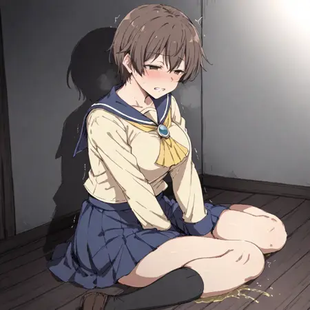 default:1girl,nakashima_naomi,short hair,brown hair,brown eyes,school uniform,sailor collar,long sleeves,beige shirt,ascot,brooch,blue skirt