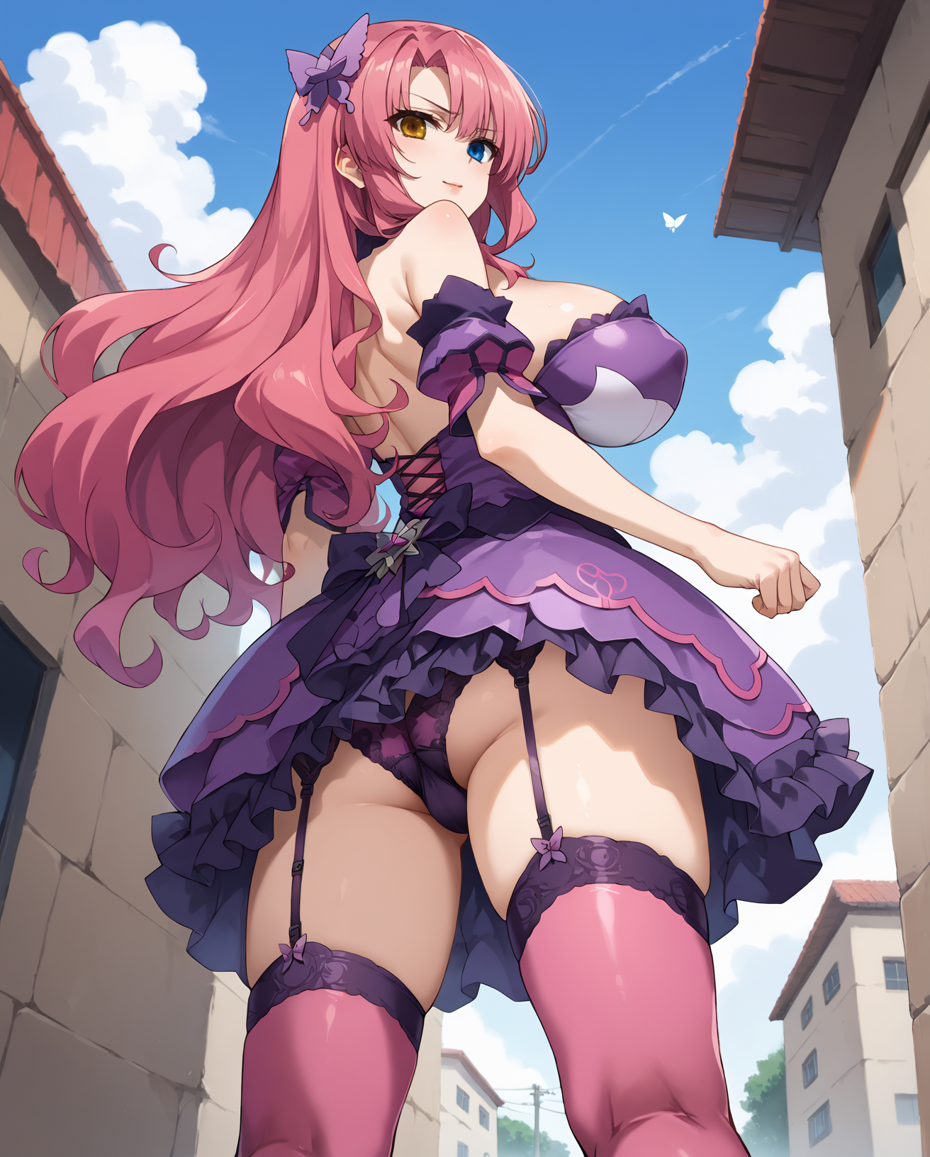 garter belt, thighhighsを身に着けていますがドレスが短くなるので、pantyhoseになっています。