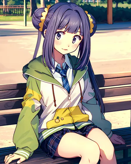 캐주얼 복장: mgrcyumeurara, 노란 헤어핀, 흰 셔츠, 파란 넥타이, 녹색과 흰 후디, 파란 플레드 치마