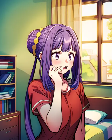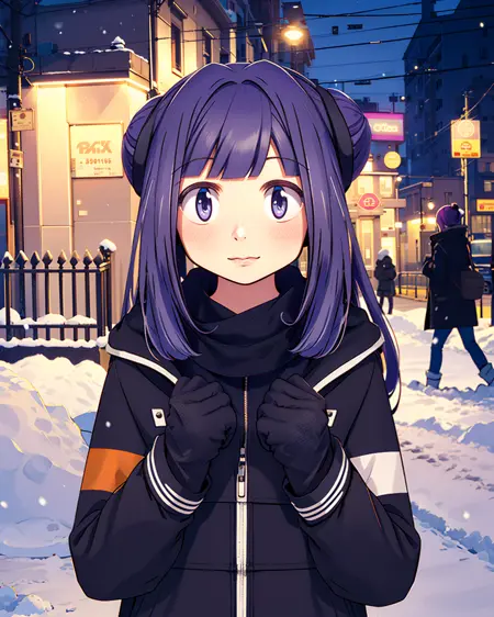 외모: 보라색 눈, 보라색 머리, 더블 둥, 트윈테일