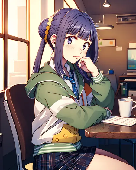 Casual outfit: mgrcyumeurara, yellow hairpins, white shirt, blue tie, green with white hoodie, blue plaid skirt