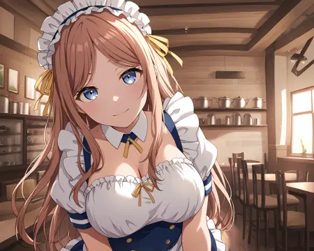 1girl, nagasakisoyo2, maidsoyo2 wrist cuffs, maidsoyo2 detached collar, maid headdress, hair ribbon, garter straps, white thighhighs, soyon4 dress, waist apron, blue shoes