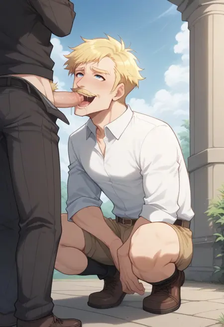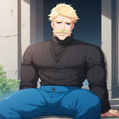 솔로, 1소년, 남성 중심, Low Creek, Low_Creek, 금발, 파란 눈, 수염, 콧수염, BREAK, 검은 속옷, 옷이 들려있는 상태, 재킷, 파란녹색/빨간 재킷, 이색 재킷, 소매를 걷어올린 상태, 왼팔 팔찌, 파란 스포츠 바지, 바지를 걷어올린 상태, 다리가 드러남, 성인, 성숙한, 남성적인, 남성다운, 잘생긴, 매력적인, 유혹적인