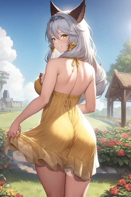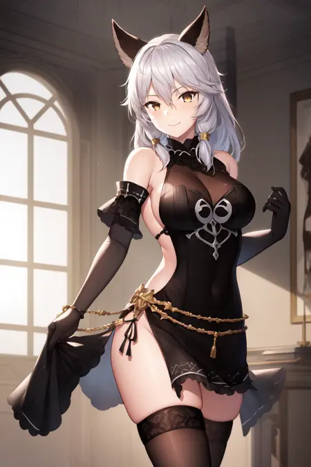 "Heles, 긴 머리, HelesEvening, 검은 무릎까지 오는 양말, 벌어진 어깨, 팔꿈치 장갑, 흰 장갑, 검은 드레스, 등이 열린 의상"