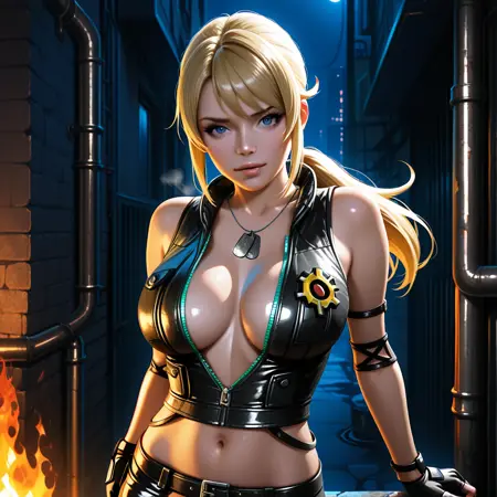 sonyablade, blonde hair, ponytail, blue eyes, black leather vest, center opening, straps, badge, boots, stilettos, cleavage, dog tags, fingerless gloves, midriff, navel, black leather pants, belt, zipper, unzipped, arm band,