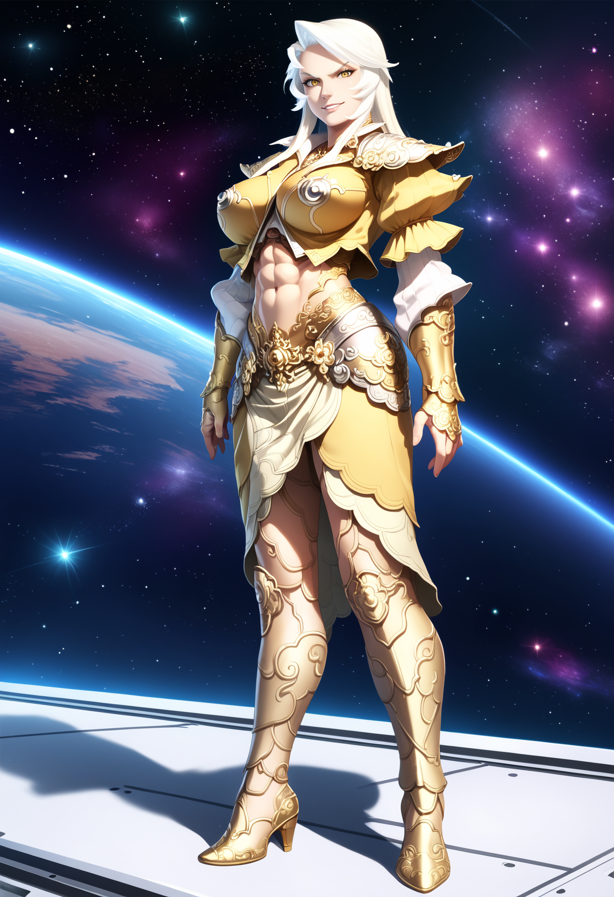 衣装プロンプト:armor, large breasts, navel, abs, midriff, high heels