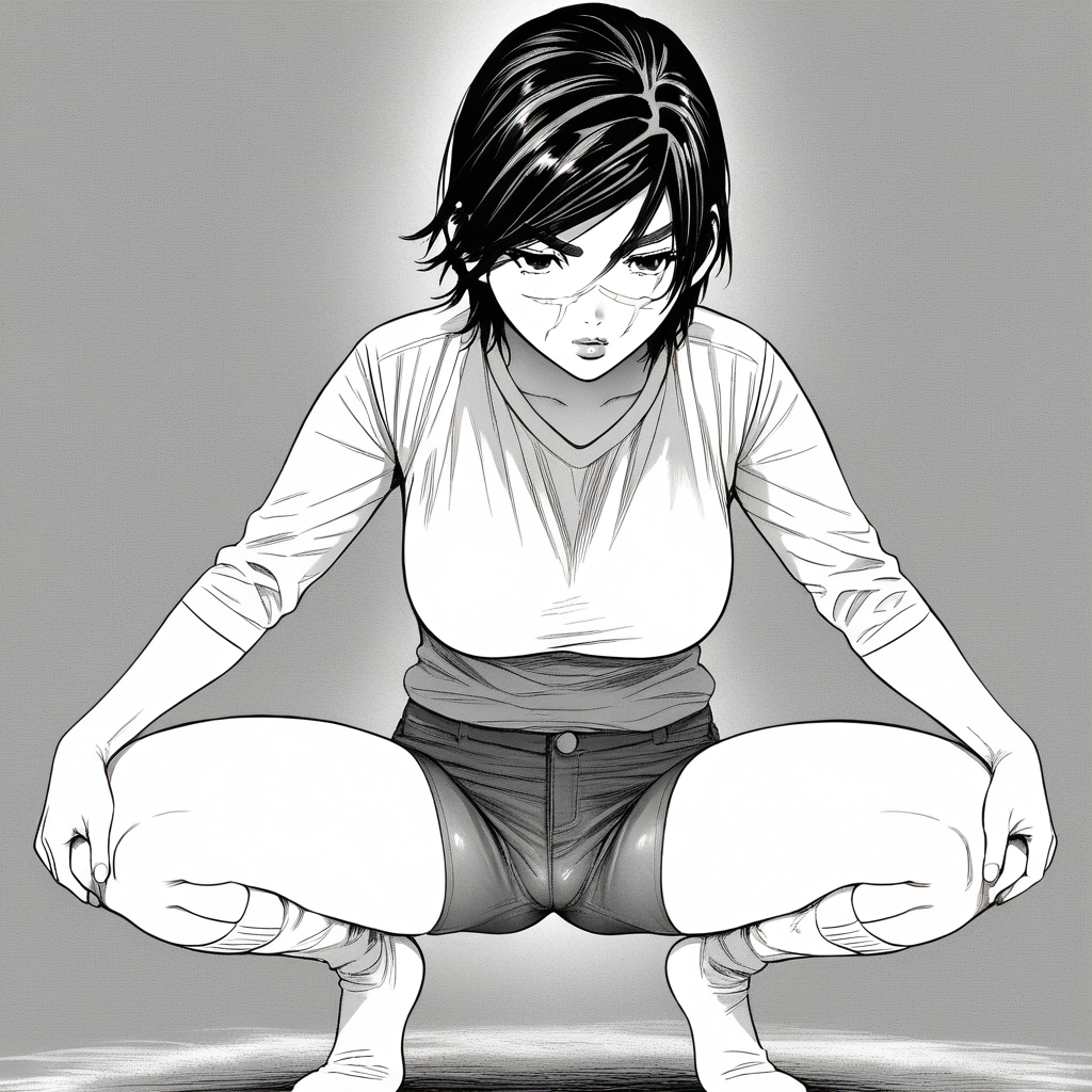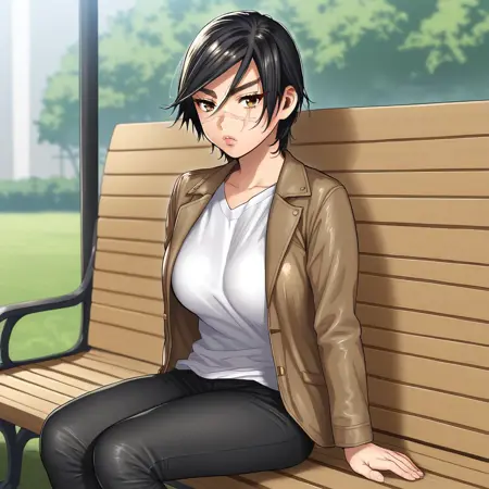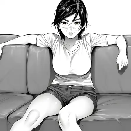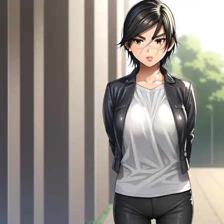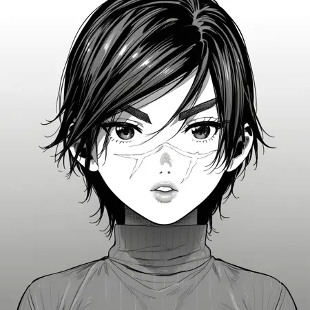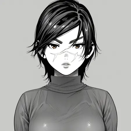 SaichiSugimoto, 1girl, solo, black hair, short hair, brown eyes, scar on face,
