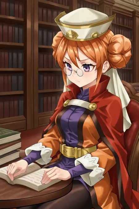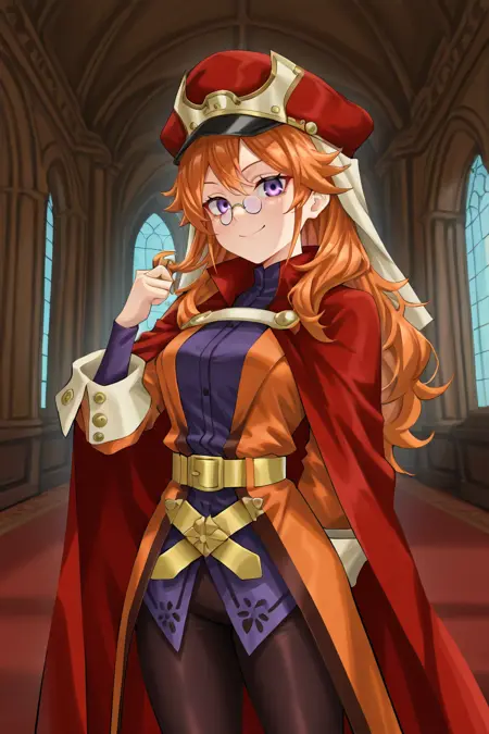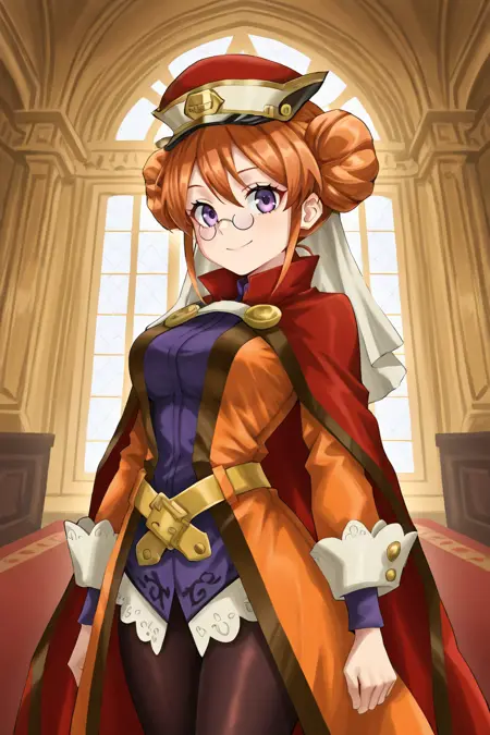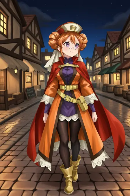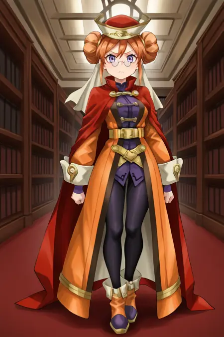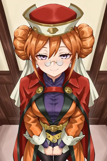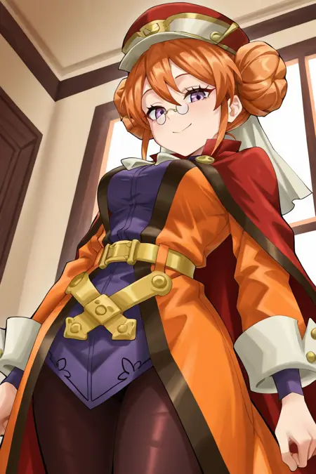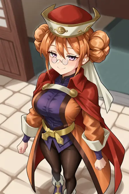 推荐标签: 1girl,紫色眼睛,橙色头发,双发髻,甜甜圈发髻,夹鼻眼镜,红色斗篷,帽子,面纱,黑色紧身裤,橙色外套,外套内衬衬衫,紫色衬衫,黄色腰带,紫色鞋子,