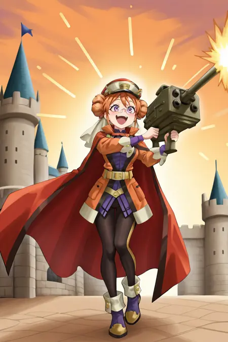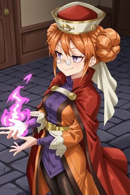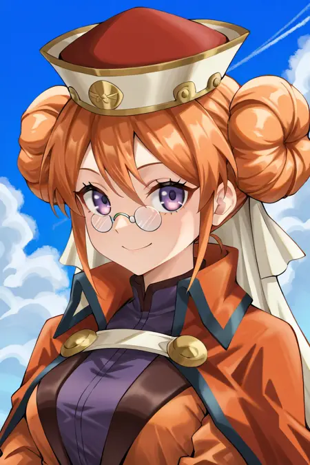 推荐标签: 1girl,紫色眼睛,橙色头发,双发髻,甜甜圈发髻,(夹鼻眼镜),(红色斗篷),帽子,面纱,黑色紧身裤,橙色外套,外套内衬衬衫,紫色衬衫,黄色腰带,紫色鞋子
