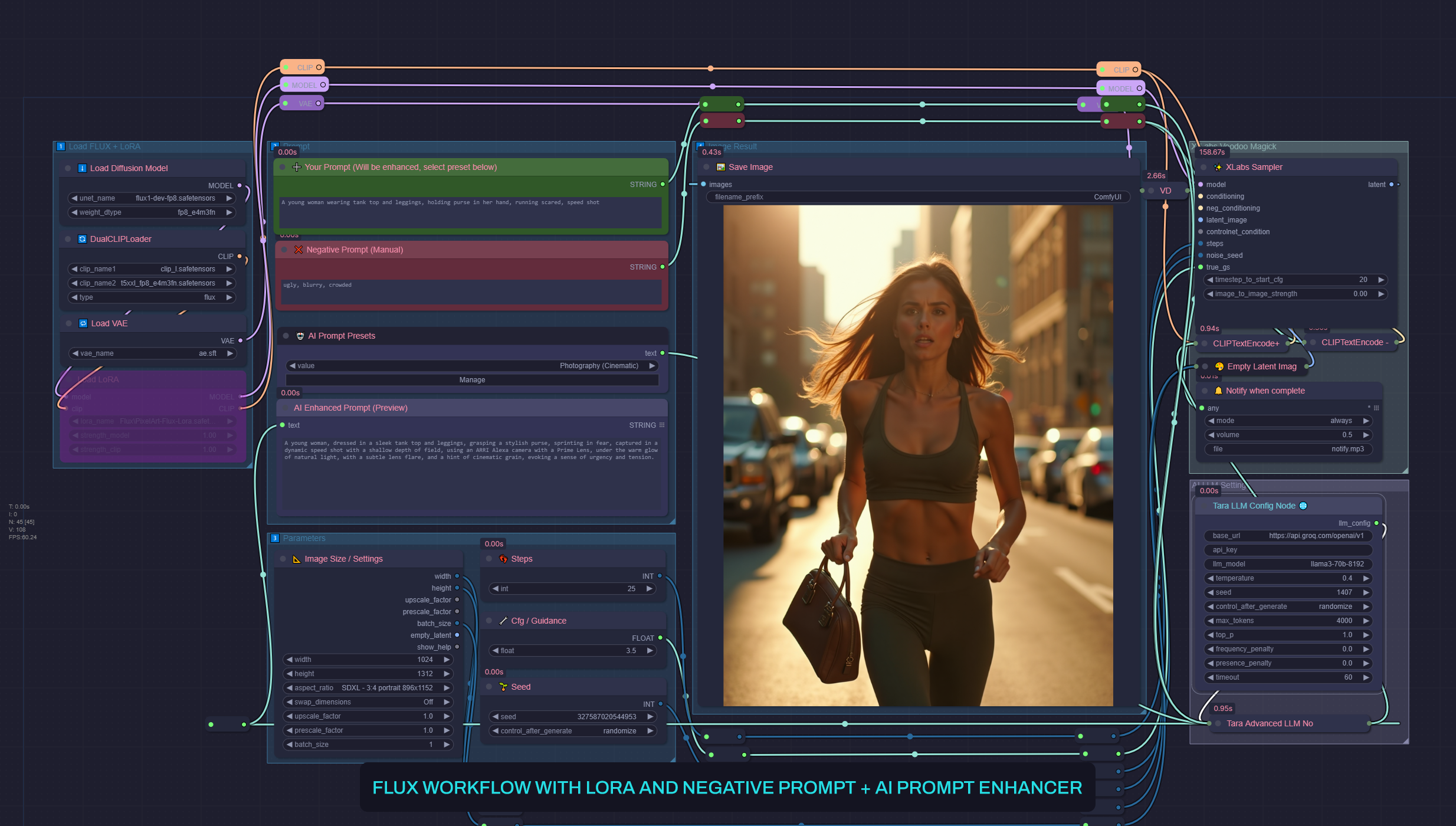 Flux 기반 워크플로우는 음성 프롬프트 지원(Xlabs Sampler 사용), LoRA 로더, Ultimate SD Upscale을 통한 업스케일링을 제공합니다. 초보자를 위한 다양한 도움말과 설명을 포함했습니다. 이미 무엇을 해야 하는지 알고 있다면 워크플로우 내의 메모를 무시하거나 삭제하셔도 됩니다.