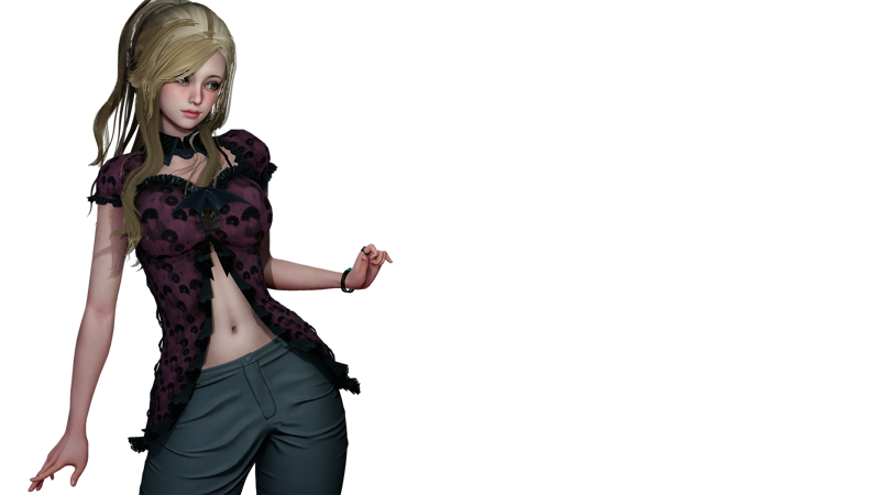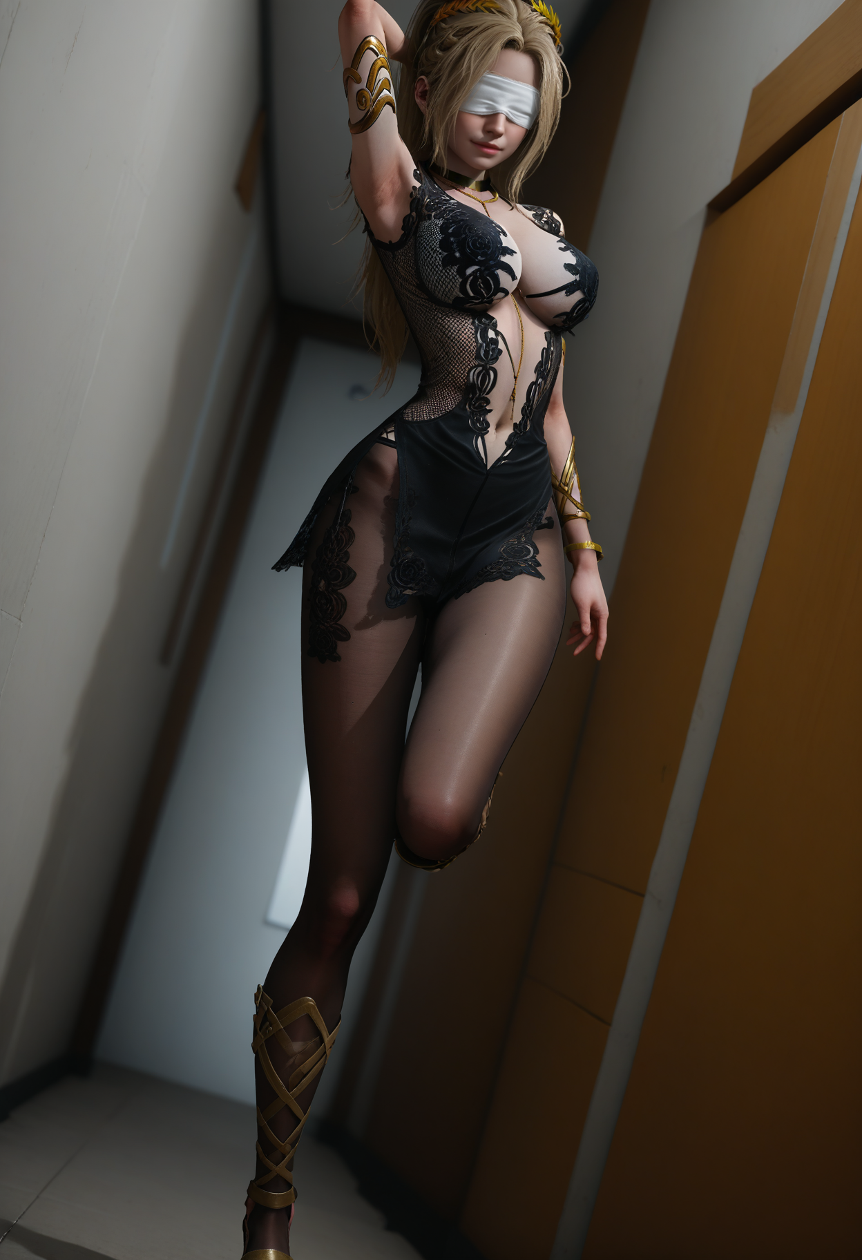 黑色衬裙:蕾丝:中央开口,丝袜:蕾丝镶边裤袜,金项圈:金项链:身体链,金臂环:金手镯:月桂花环,白色眼罩,角斗士凉鞋,遮帘发:马尾。