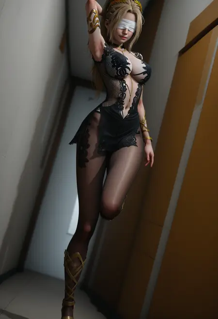 검은 커미즈:레이스:중앙 오프닝, 팬티하임:레이스 테두리 다리 웨어, 골드 초커:골드 목걸이:바디 체인, 골드 팔찌:골드 팔찌:로렌 화관, 흰 밴드, 글라디에이터 샌들. 커튼 헤어:피그테일.
