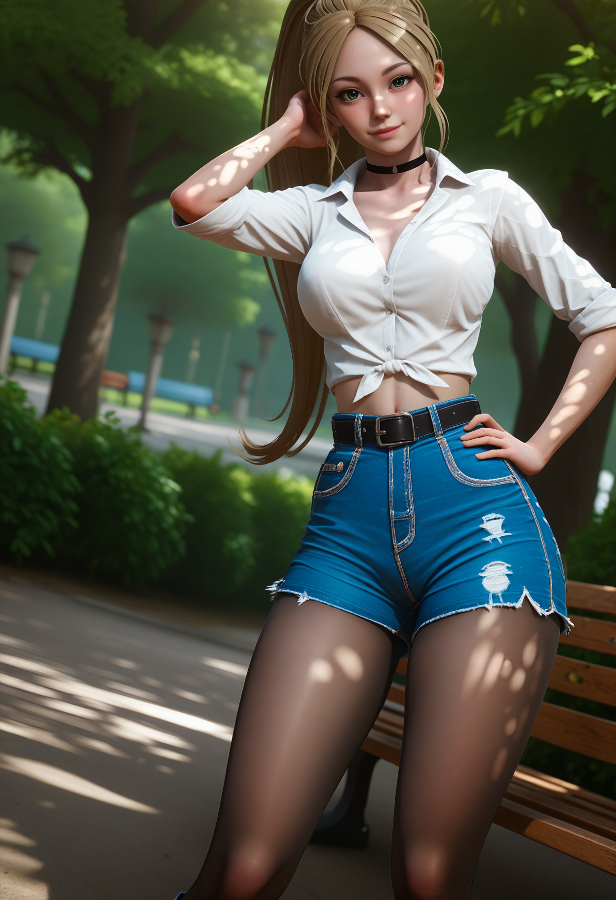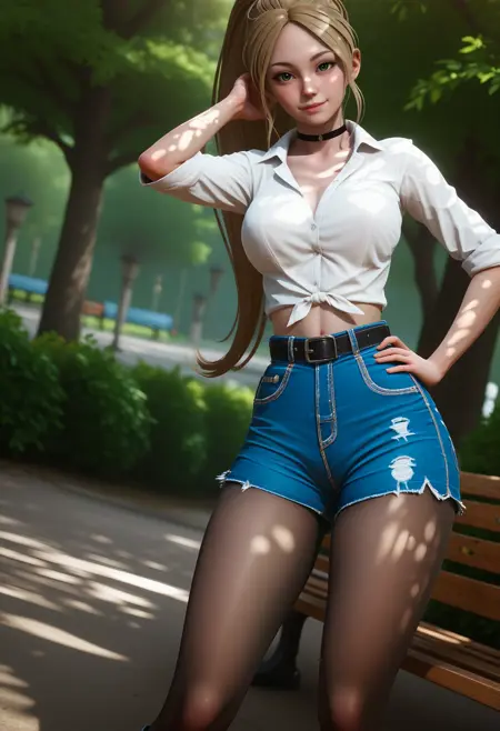白色系带衬衫:袖子卷起,高腰短裤:牛仔短裤:短裤下穿丝袜,黑色腰带,黑色项圈,翻折靴子,高马尾。
