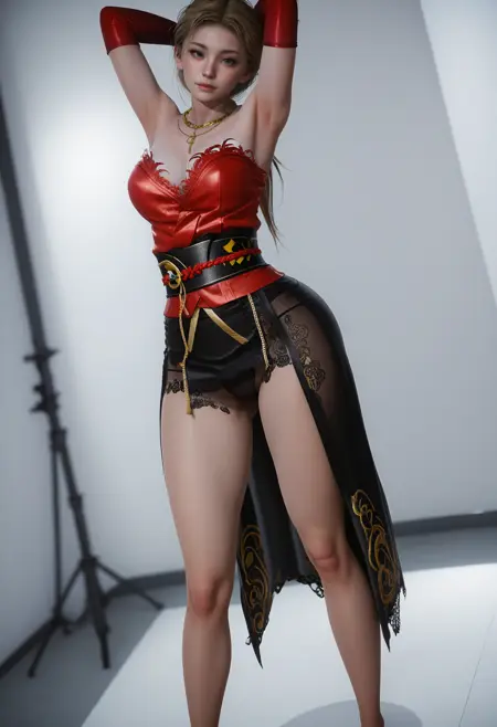 红色无肩带衬衫:华丽服饰,腰带:腰带结:金链,蕾丝镶边内裤:黑色内裤,外裙,新娘手套,颈环,赤脚。低马尾。