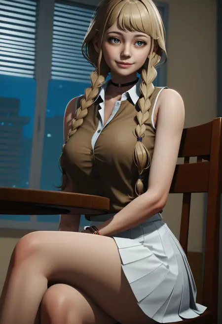 有领衬衫:无袖上衣:棕色衬衫,百褶裙:白色裙子,O型项圈,手镯,戒指,双辫子,