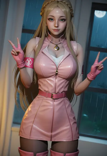 粉色拉链连衣裙:无袖裙:粉色腰带,护身符,臂环,无指手套:粉色手套,丝袜,大腿靴,极长发:皇冠编发,