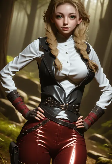 皮质背心,长袖衬衫:纽扣:白色衬衫,刀鞘:剑:已收鞘,皮裤:红色裤子:腰带包,无指肘套:腕带,腰带靴。低双辫子。