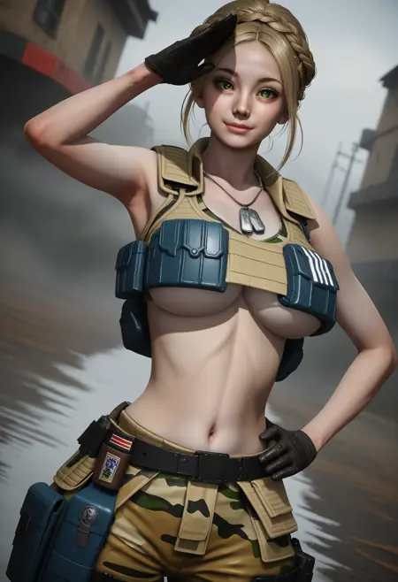 총알 방탄 조끼:비키니 상의만:언더부브, 도그 태그, 팔 지퍼, 유틸리티 벨트:카모 팬츠:허벅지 홀스터, 검은 장갑. 프렌치 브레드.