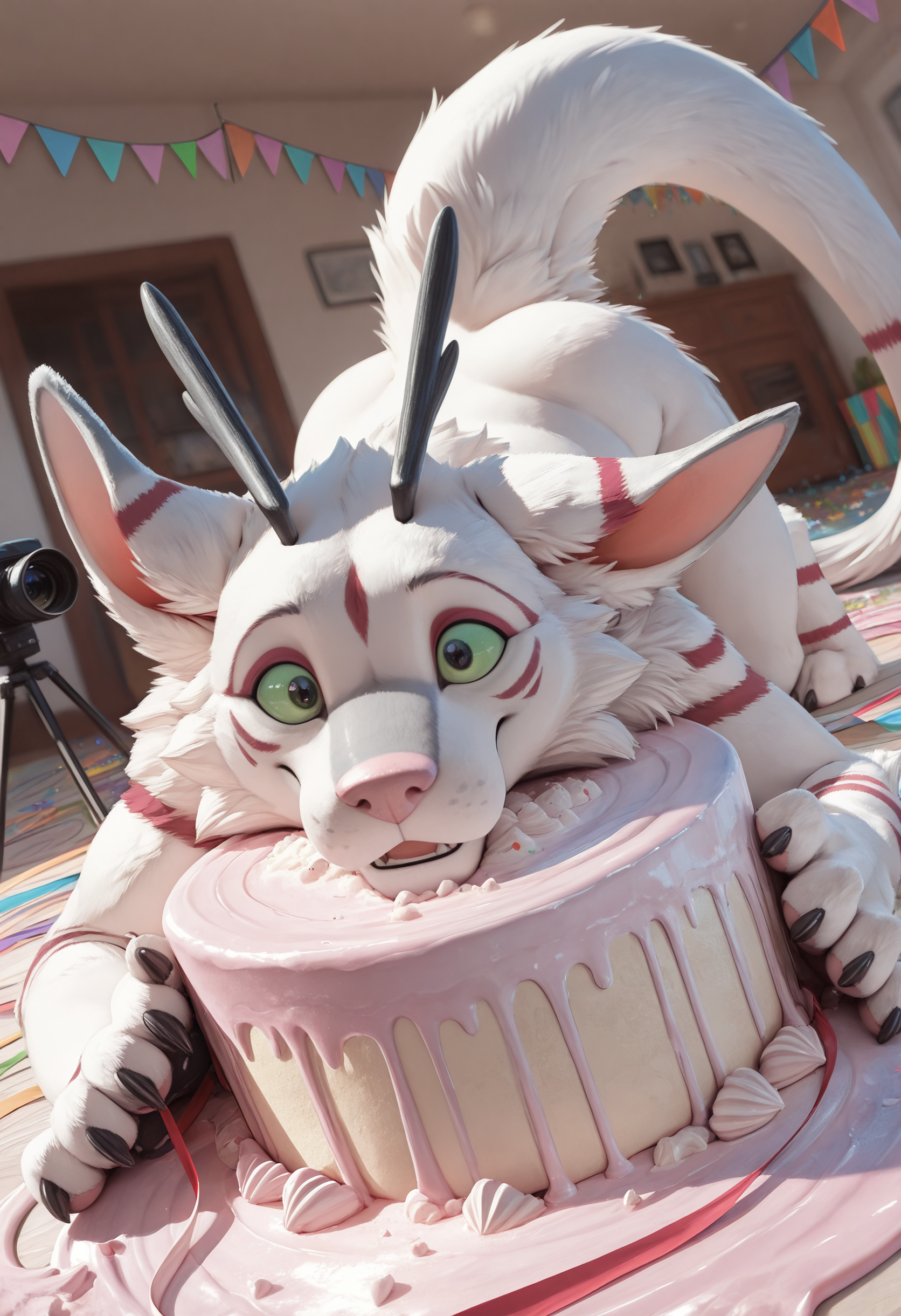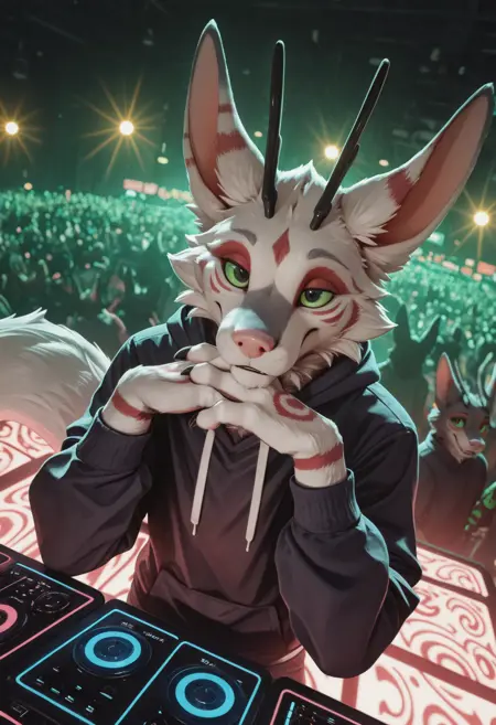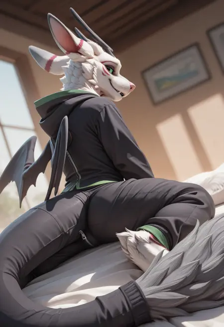 // Illustrious: tiesci, dragon, furred dragon, furred scalie, furry, solo, tail, body fur, furry male, animal ears, male focus, 1boy, claws, pink nose, green eyes, green sclera