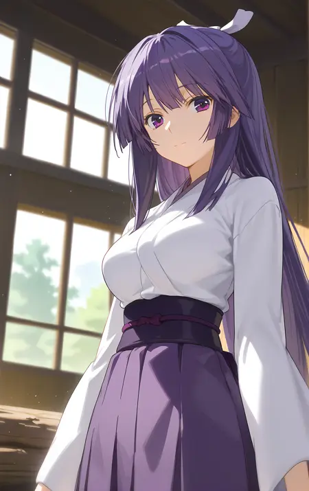 복장 1 → japanese_clothes, kimono, sash, kimono, skirt, hakama, hakama_skirt, purple_hakama, white_kimono,