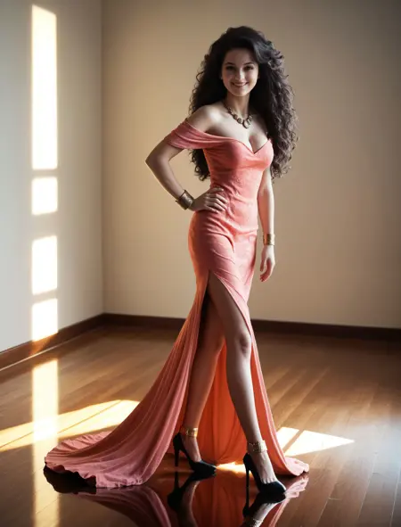 一张真实照片,一位女性,独处,面部细节丰富,眼睛细致,妆容,沙漏体型,长发,浓密秀发,