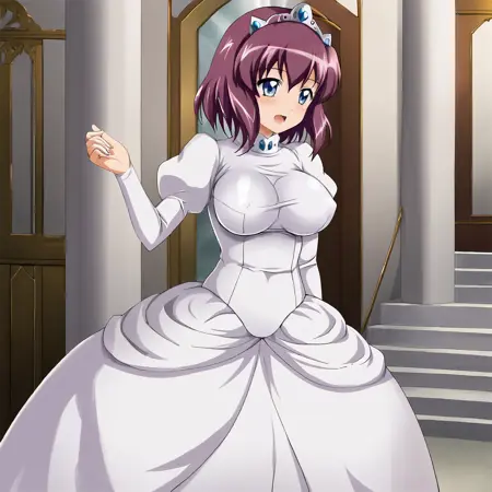 트리거 2: Henrietta, 파란 눈, 보라색 머리, 흰색 드레스, 왕관, 큰 가슴, 1girl, 공주, 단발, 풍성한 소매, 긴 소매, 티아라