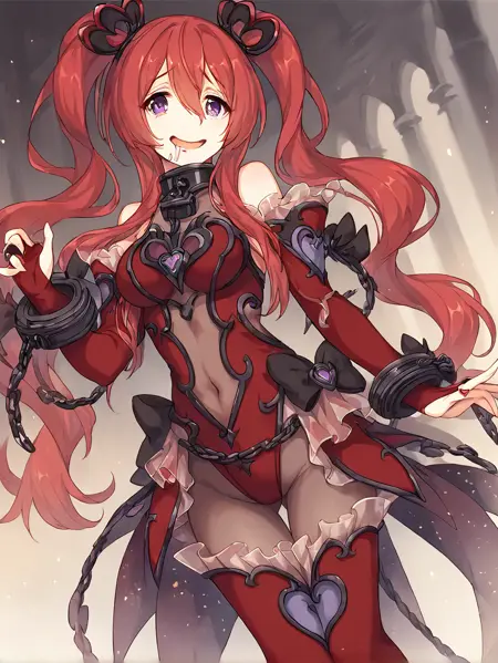 - kukabase, 빨간 머리, 긴 머리, 눈 사이의 머리, 보라색 눈, kukanoire, 빨간 레오타드, 더블 테일, 옆머리, 중간 길이 머리, 검은 리본, 배꼽 가린 상태, 브라이덜 겐틀렛, 빨간 겐틀렛, 허벅지 스타킹, 검은 팔찌, 투명한 소재, 팬티하이즈
