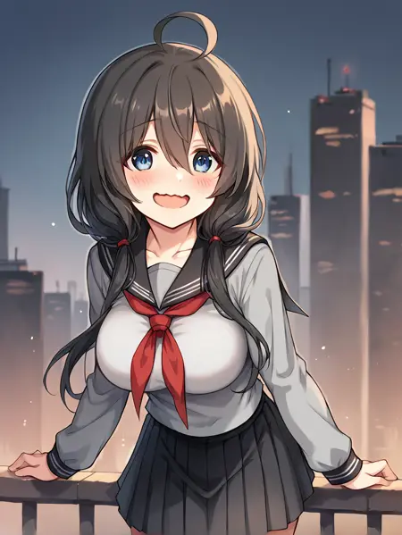 - tomikukabase, 검은 머리, 눈 사이의 머리, 파란 눈, 낮은 더블 테일, 아호게, tomikukauni, serafuku, 검은 해적 칼라, 검은 치마, 주름 치마, 회색 셔츠, 긴 소매, 빨간 넥타이